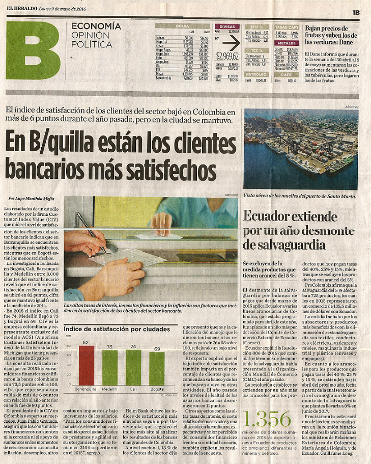 El índice de satisfacción de los clientes del sector bajó en Colombia en más de 6 puntos durante el año pasado, pero en la ciudad se mantuvo. Fecha de la publicación: Monday, May 9, 2016